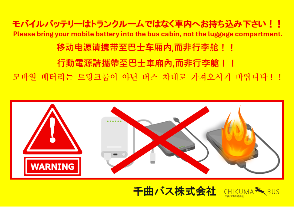 モバイルバッテリーは、高温・衝撃等により発火の恐れがあるため、トランクルームへの収納はご遠慮いただき、バス車内へお持ちいただくようお願いいたします。