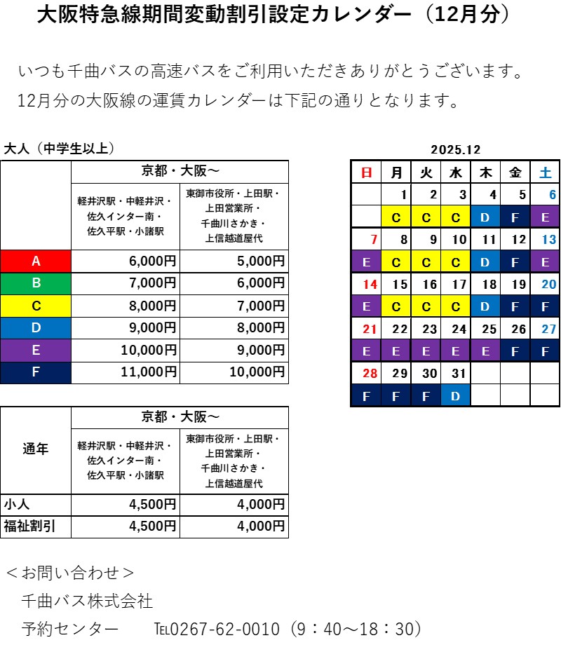 運賃京都:高速バス大阪線の運賃カレンダーにつきまして Previous Post Next Post 高速バスからのお知らせ 池袋・新宿線運賃カレンダー 2025年9月30日 立川線運賃カレンダー 2025年9月30日 【11/1~】「立川ー軽井沢・草津線」ダイナミックプライシング(価格変動)型運賃導入のお知らせ 2025年9月29日 【追記】東梅田駅6・7番出入り口閉鎖に伴う高速バス「大阪駅前(東梅田駅)」のりばへのアクセス方法変更について 2025年9月11日2025年9月11日 10/12真田まつり開催による池袋線上田便の迂回運行につきまして 2025年9月9日 立川~軽井沢・草津線の西武バス及び西武観光バス窓口での取扱い終了につきまして 2025年9月3日 10/1~高速バス池袋-軽井沢線の減便について 2025年9月1日 2025年9・10・11・12月分 高速バス大阪線の運賃カレンダーにつきまして 2025年9月1日2025年9月30日 2025年9・10月分 高速バス立川線の運賃カレンダーにつきまして 2025年9月1日2025年9月30日 2025年9・10・11月分 高速バス池袋・新宿線の運賃カレンダーにつきまして 2025年9月1日2025年9月30日