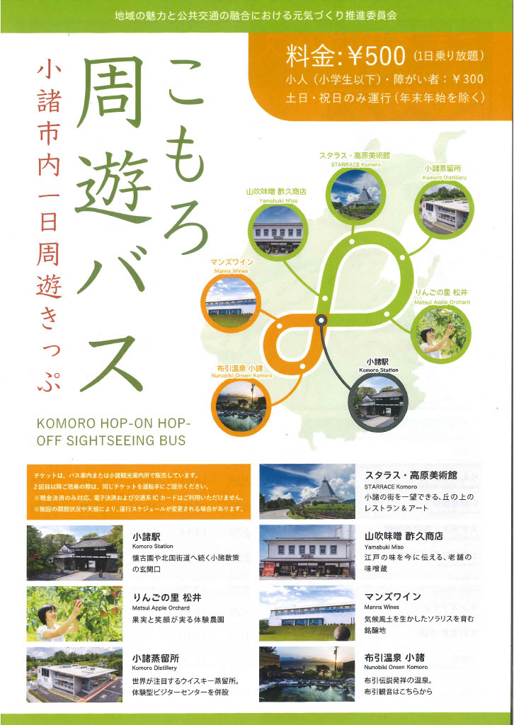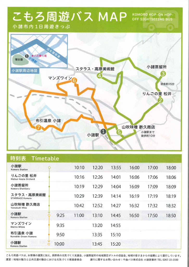 路線バス:【11/1~】こもろ周遊バス運行開始のお知らせ 運行日:土日祝日(年末年始を除く)運 賃:一日乗車券:大人500円、小人・福祉割引300円販 売:乗車券は小諸市観光案内所及びバス車内で販売。(現金決済のみ) バスの運行に関するお問い合わせ 千曲バス小諸営業所TEL:0267-22-2100(営業時間 9:40~8:30) Next Post 路線バスからのお知らせ 11/4~軽井沢町内循環バス西コース迂回運行のお知らせ 2025年10月22日 11/10~青木線停留所移動のお知らせ 2025年10月20日 9/29~[青木線]工事による停留所移動のお知らせ 2025年9月22日 10/21~軽井沢町内循環バス西コース迂回運行のお知らせ 2025年9月4日 上田市内路線バスについてのお知らせ 2025年8月25日2025年9月10日 【10月1日改正】時刻・運賃の改正につきまして 2025年8月8日2025年8月26日 8/18~【中仙道線】工事による迂回運行につきまして 2025年8月1日2025年8月1日 スマホ定期券の路線バス全路線の販売開始について 2025年4月12日2025年4月14日 1/1~上田松本線 運行営業所の変更につきまして 2025年1月1日2025年1月15日 10/1(日)~定期券(新規・継続)取扱い開始日の変更について 2023年9月25日2023年9月25日 佐久市内路線バスにおけるQRコード決済の導入につきまして 2022年12月6日2022年12月28日 令和4年12月29日 中仙道線・佐久御代田線の「浅間総合病院東」停留所廃止について 2022年11月23日2022年11月23日 令和4年11月1日~令和5年6月12日 青木線の工事による殿戸停留所(上田行)の移設について 2022年11月1日2022年11月30日 令和4年4月1日 路線バス時刻改正につきまして(3/11追記有) 2022年4月1日2022年11月23日 72年間 佐久・上田線ご利用ありがとうございました 2022年3月31日2022年11月23日 上田市公共交通QRコード決済実証実験について 2022年3月30日2022年11月23日 令和3年10月1日 路線バス中仙道線の改正につきまして(6/17時刻表訂正) 2022年3月23日2022年11月23日 令和3年10月1日 路線バス佐久上田線の廃止につきまして 2022年2月20日2022年11月23日 令和3年4月1日 路線バス祢津(鹿沢)線の廃止につきまして 2022年2月1日2022年11月23日 令和3年4月1日 路線バス内山線の廃止につきまして 2022年1月31日2022年11月23日