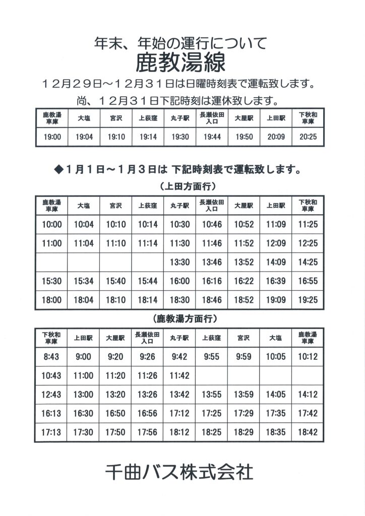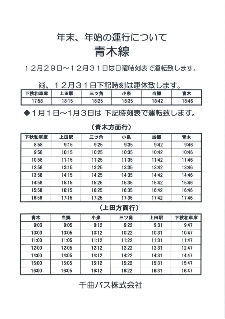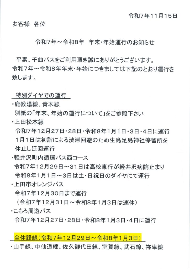 路線バス:年末年始の路線バスの運行につきまして Next Post 路線バスからのお知らせ 【追記】11/4~軽井沢町内循環バス西コース迂回運行のお知らせ 2025年11月7日 【11/1~】こもろ周遊バス運行開始のお知らせ 2025年11月5日2025年11月5日 11/10~青木線停留所移動のお知らせ 2025年10月20日 9/29~[青木線]工事による停留所移動のお知らせ 2025年9月22日 10/21~軽井沢町内循環バス西コース迂回運行のお知らせ 2025年9月4日 上田市内路線バスについてのお知らせ 2025年8月25日2025年9月10日 【10月1日改正】時刻・運賃の改正につきまして 2025年8月8日2025年8月26日 8/18~【中仙道線】工事による迂回運行につきまして 2025年8月1日2025年8月1日 スマホ定期券の路線バス全路線の販売開始について 2025年4月12日2025年4月14日 1/1~上田松本線 運行営業所の変更につきまして 2025年1月1日2025年1月15日 10/1(日)~定期券(新規・継続)取扱い開始日の変更について 2023年9月25日2023年9月25日 佐久市内路線バスにおけるQRコード決済の導入につきまして 2022年12月6日2022年12月28日 令和4年12月29日 中仙道線・佐久御代田線の「浅間総合病院東」停留所廃止について 2022年11月23日2022年11月23日 令和4年11月1日~令和5年6月12日 青木線の工事による殿戸停留所(上田行)の移設について 2022年11月1日2022年11月30日 令和4年4月1日 路線バス時刻改正につきまして(3/11追記有) 2022年4月1日2022年11月23日 72年間 佐久・上田線ご利用ありがとうございました 2022年3月31日2022年11月23日 上田市公共交通QRコード決済実証実験について 2022年3月30日2022年11月23日 令和3年10月1日 路線バス中仙道線の改正につきまして(6/17時刻表訂正) 2022年3月23日2022年11月23日 令和3年10月1日 路線バス佐久上田線の廃止につきまして 2022年2月20日2022年11月23日 令和3年4月1日 路線バス祢津(鹿沢)線の廃止につきまして 2022年2月1日2022年11月23日