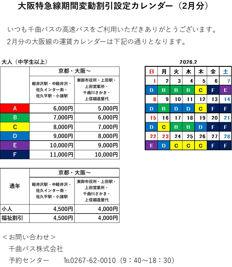 高速バス:2025年12~2026年2月分 高速バス大阪線の運賃カレンダーにつきまして Previous Post Next Post 高速バスからのお知らせ 池袋・新宿線運賃カレンダー 2025年12月1日 高速バス大阪線の運賃カレンダーにつきまして 2025年12月1日 2025年12月、2026年1月分 高速バス池袋・新宿線の運賃カレンダーにつきまして 2025年12月1日2025年12月1日 「千曲線」年末年始の運行再開便につきまして 2025年11月21日2025年11月27日 12/15~工事による「川越的場」停留所休止のお知らせ 2025年11月14日2025年11月17日 小諸高原停留所 バス停標識撤去のお知らせ 2025年11月11日 【11/1~】「立川ー軽井沢・草津線」ダイナミックプライシング(価格変動)型運賃導入のお知らせ 2025年10月31日 立川線の運賃について 2025年10月31日 高速バス・貸切バスへのモバイルバッテリーの持ち込みについて 2025年10月10日2025年11月19日 【追記】東梅田駅6・7番出入り口閉鎖に伴う高速バス「大阪駅前(東梅田駅)」のりばへのアクセス方法変更について 2025年9月11日2025年9月11日
