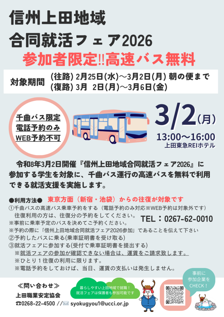 千曲バスでは学生就活応援企画として、3月2日の合同就活フェアに参加される方が下記期間に下記の高速バス便をご予約されると、高速バス運賃が無料となる企画を上田職業安定協会と実施いたします。